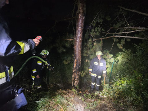 Der Flurbrand wurde mittels C-Hohlstrahlrohr gelöscht, Glutnester mit der Wärmebildkamera aufgespürt und mit der Spitzhacke beseitigt.